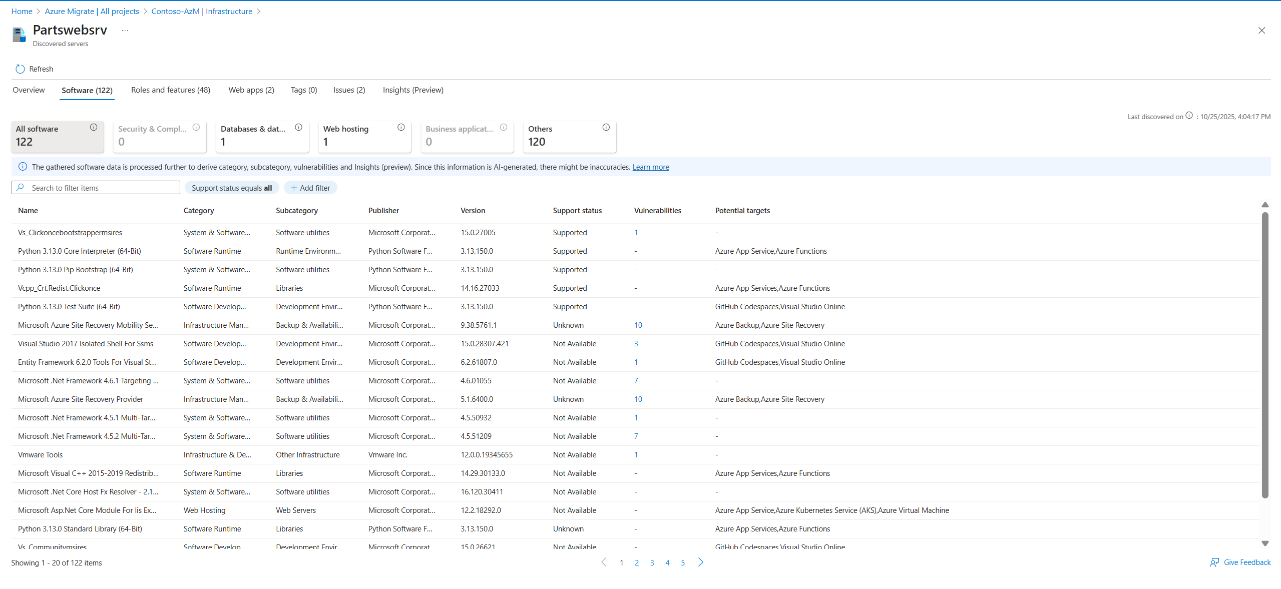 - Go to your Azure Migrate project and from the left menu, select Infrastructure under Explore inventory to review software discovered from each server.