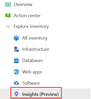 In the left menu, select Explore inventory > Insights (preview) to review security insights for the selected project. This page provides a summary of security risks across discovered servers and software.