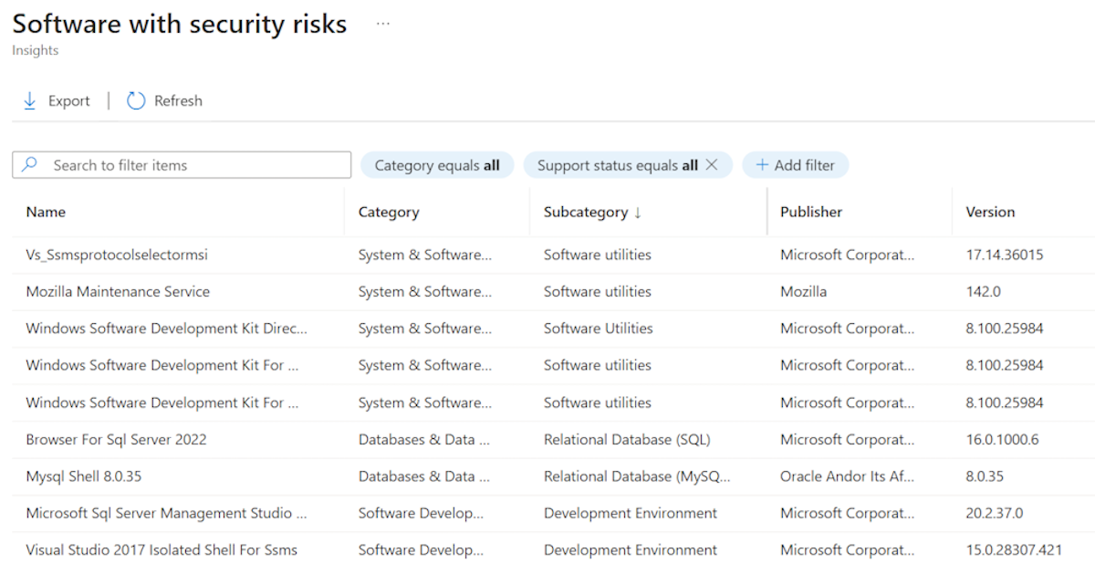 To view software with specific security risks, go to the Insights (preview) pane. here, you see a detailed list of software affected due to the following issues: