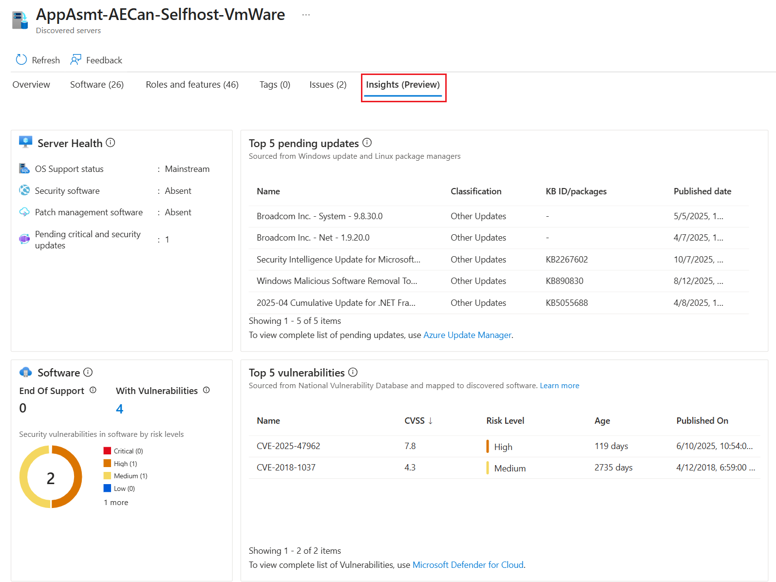 Select the Insights (preview) tab. The tab displays security insights for the selected server, including: