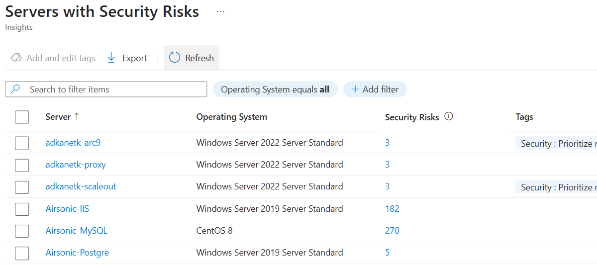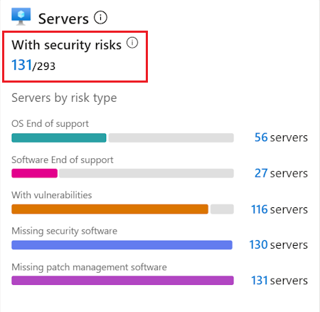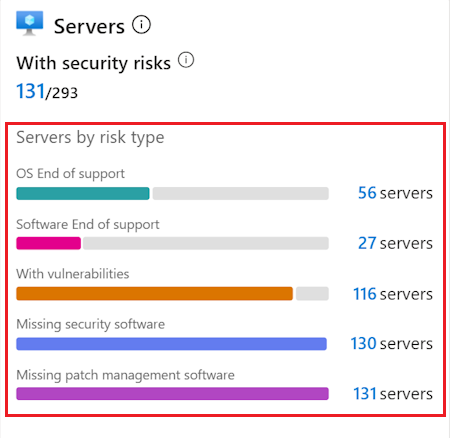 | Servers | With security risks | Servers are flagged if they have at least one of the following security risks: End-of-support operating system, End-of-support software, Known vulnerabilities (CVEs), Missing security or patch management software, Pending critical or security updates |
