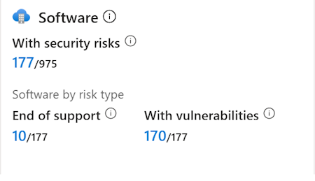 The Software Card shows a summary of all discovered software with security risks. Software is flagged as at risk if it is either end-of-support or has known vulnerabilities (CVEs). The card displays the number of end-of-support software and software with vulnerabilities as fractions of the total software with security risks.