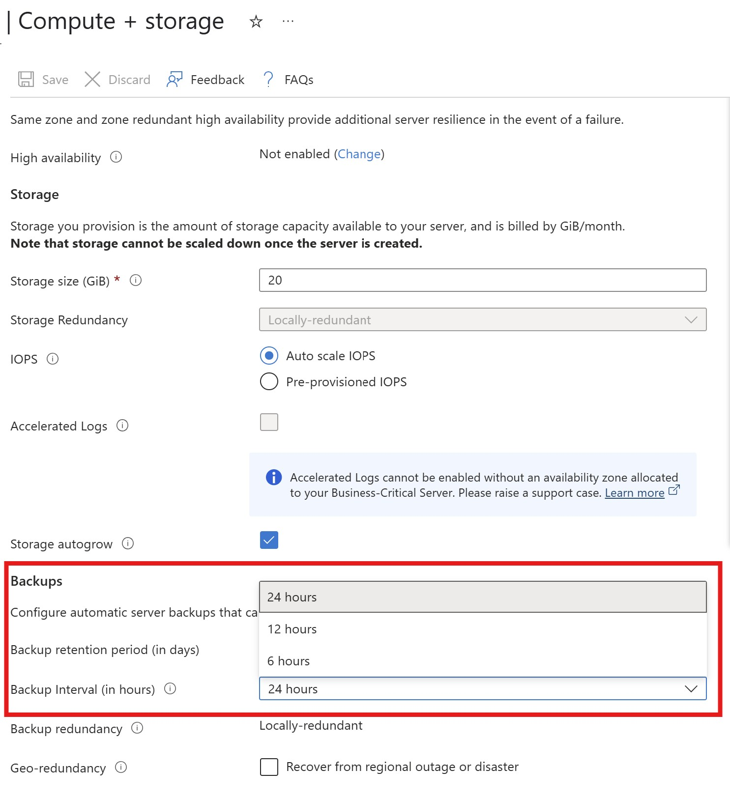 To modify the backup interval, navigate to the Settings > Compute + Storage section and set the Backup Interval field accordingly. While the default interval is set to 24 hours, it can be adjusted to either 12 or 6 hours.