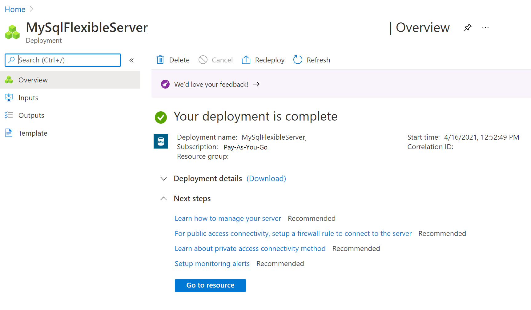 You've created an Azure Database for MySQL Flexible Server instance in a resource group. If you don't expect to need these resources in the future, you can delete them by deleting the resource group or the Azure Database for MySQL Flexible Server instance. To delete the resource group, complete these steps: