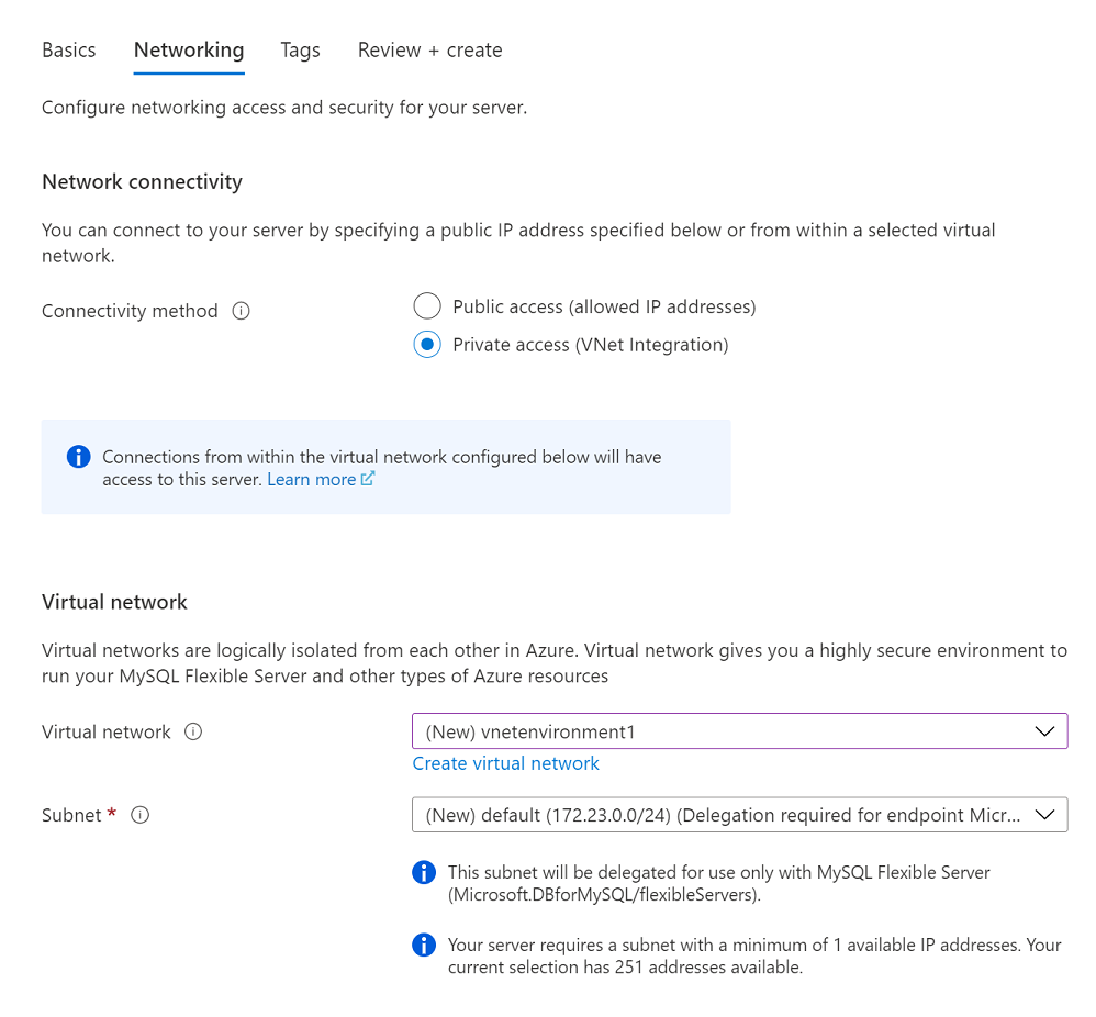 Go to the Networking tab, select private access.You can't change the connectivity method after you create the server. Select Create virtual network to create a new virtual network vnetenvironment1.