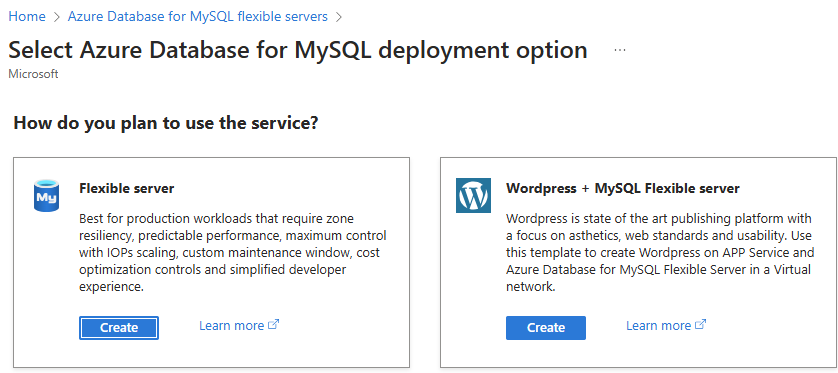 On the Select Azure Database for MySQL deployment option pane, select Flexible server as the deployment option: