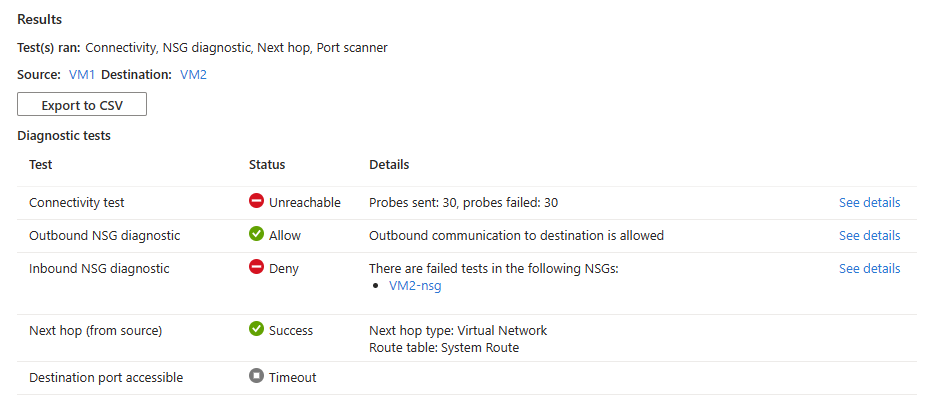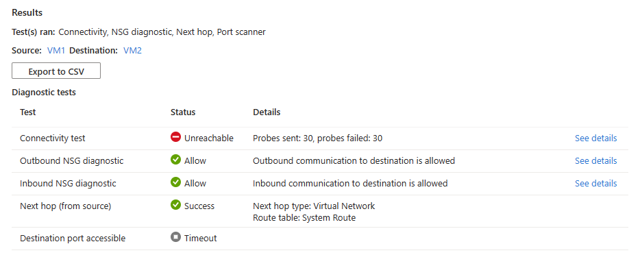 • Inbound connectivity to the destination virtual machine is allowed. Select See details to see the security rules that are allowing the inbound communication to the destination virtual machine.