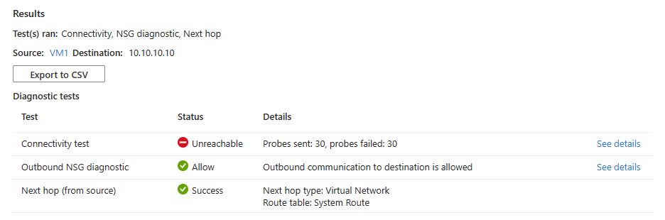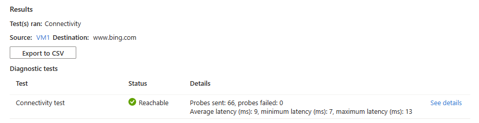 • 66 probes were successfully sent to the destination virtual machine. Select See details to see the next hop details.