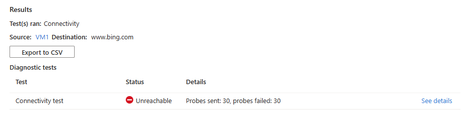 • If www.bing.com is unreachable from the source virtual machine due to a security rule, you see the following results: