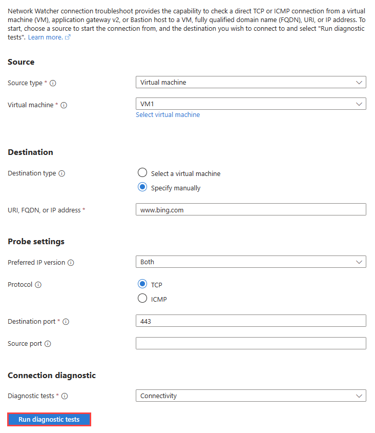 3. Under Network diagnostic tools, select Connection troubleshoot. Enter or select the following values: