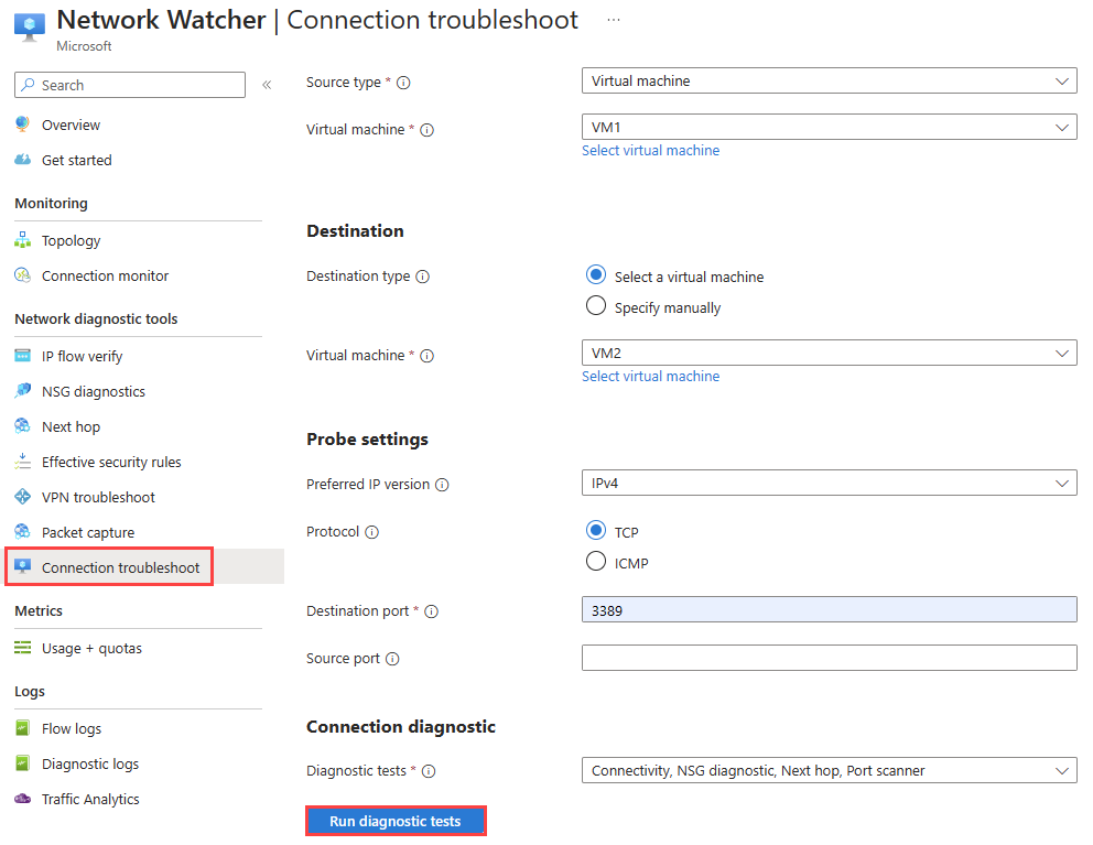 Diagnostics tests Select Connectivity, NSG diagnostic, Next hop, and Port scanner.