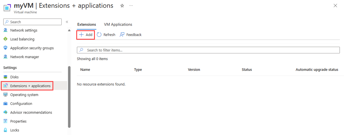 Select + Add and search for Network Watcher Agent and install it. If the extension is already installed, you can see it in the list of extensions.