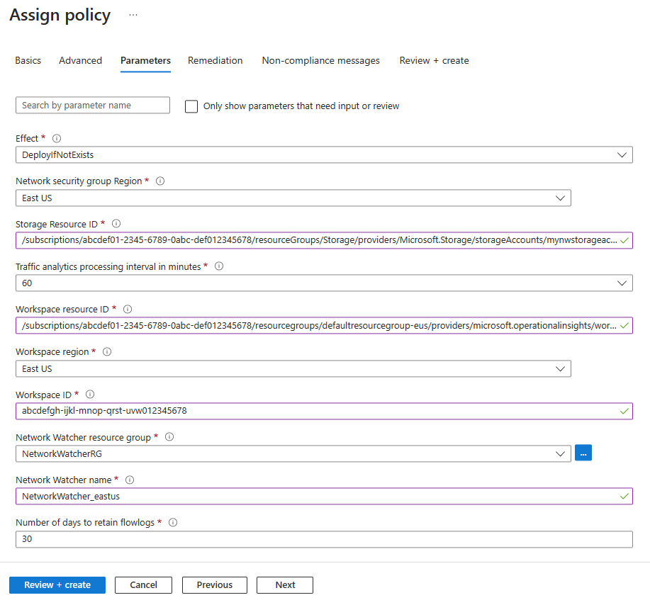 Setting Value Effect Select DeployIfNotExists. Network security group region Select the region of your network security group that you're targeting with the policy. Storage resource ID Enter the full resource ID of the storage account. The storage account must be in the same region as the network security group. The format of storage resource ID is: /subscriptions/<SubscriptionID>/resourceGroups/<ResourceGroupName>/providers/Microsoft.Storage/storageAccounts/<StorageAccountName>.Traffic analytics processing interval in minutes Select the frequency at which processed logs are pushed into the workspace. Currently available values are 10 and 60 minutes. Default value is 60 minutes. Workspace resource ID Enter the full resource ID of the workspace where traffic analytics has to be enabled. The format of workspace resource ID is: /subscriptions/<SubscriptionID>/resourcegroups/<ResourceGroupName>/providers/microsoft.operationalinsights/workspaces/<WorkspaceName>.Workspace region Select the region of your traffic analytics workspace. Workspace ID Enter your traffic analytics workspace ID. Network Watcher resource group Select the resource group of your Network Watcher. Network Watcher name Enter the name of your Network Watcher. Number of days to retain flow logs Enter the number of days for which you want to retain flow logs data in the storage account. If you want to retain data forever, enter 0. Note