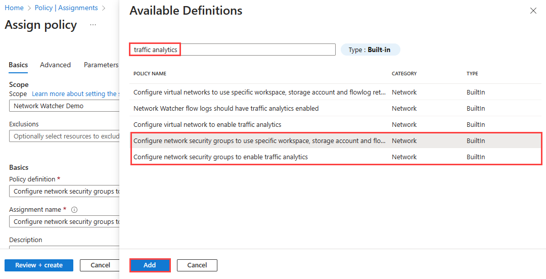Select the ellipsis ... next to Policy definition to choose the built-in policy that you want to assign. Enter traffic analytics in the search box, and select the Built-in filter. From the search results, select Configure network security groups to use specific workspace, storage account and flow log retention policy for traffic analytics and then select Add.
