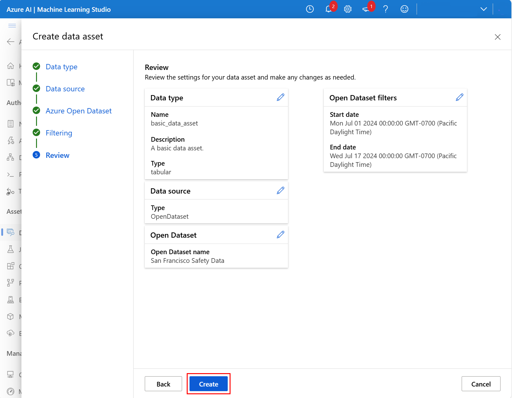 At the next screen, review the settings for the new data asset, and make any necessary changes. When it seems good, select Create as shown in this screenshot: