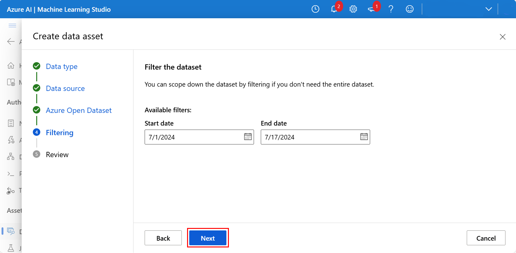 Optionally, filter the data with the available filters, appropriate for the chosen dataset. For the San Francisco Safety Data dataset, we set the filtered date range between a start date of July 1, 2024 and July 17, 2024. Select Next, as shown in this screenshot: