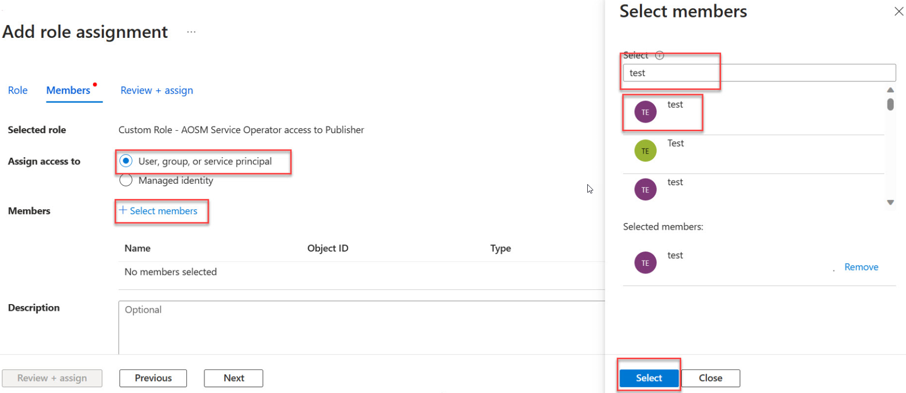 Select User, group, or service principal, then Choose + Select Members then find and choose the users you want to have access. Choose Select.