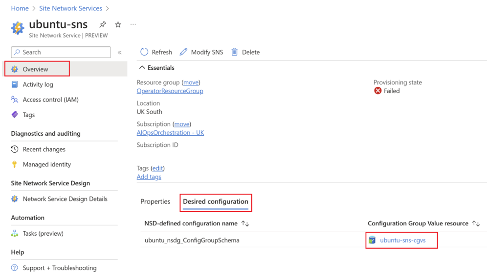 Under the Overview section, take note of the Configuration Group Value and the resource group within Desired configuration.