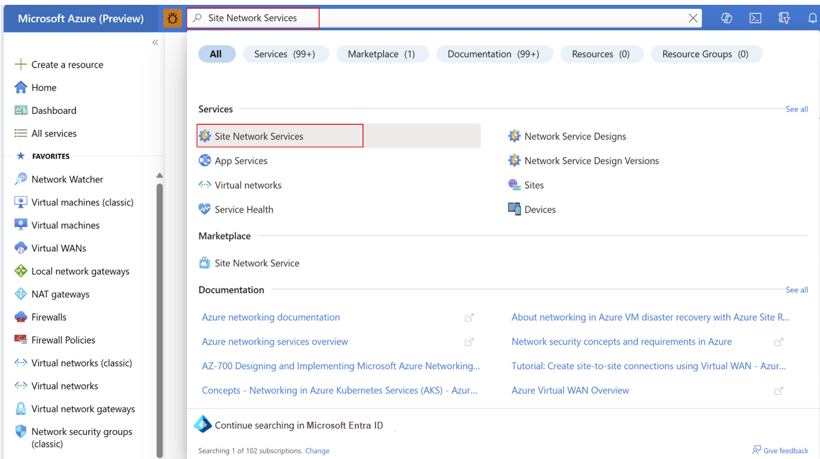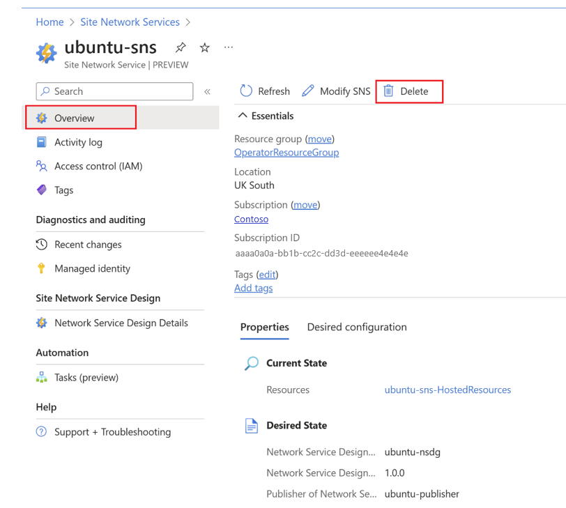 Select the Site Network Service (SNS) within the Azure portal you wish to delete.