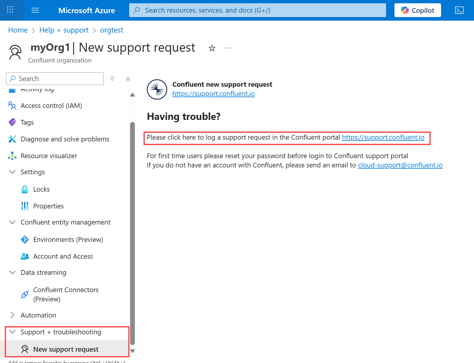 In the portal, you can either submit a request via Azure help and support or submit a request directly from your instance of Apache Kafka & Apache Flink on Confluent Cloud on Azure.