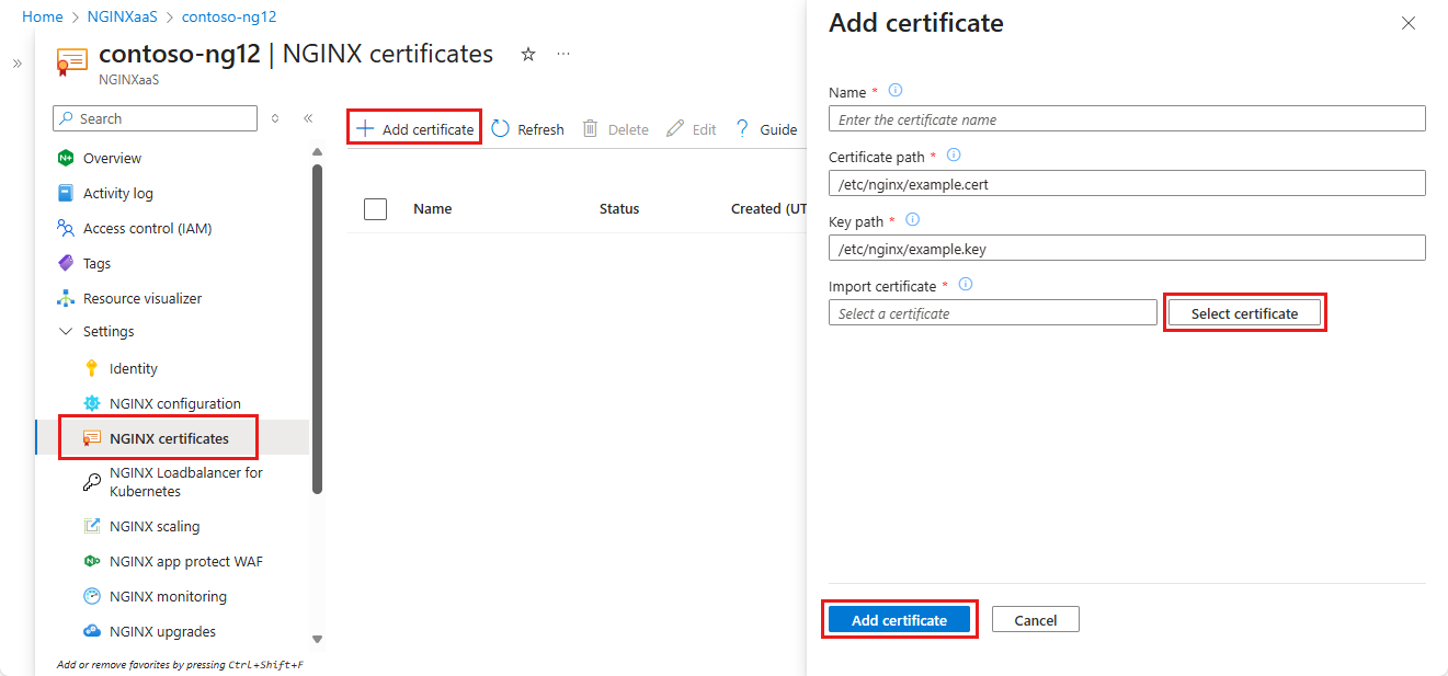 In your NGINXaaS deployment, in the left menu, select Settings > NGINXaaS certificates.