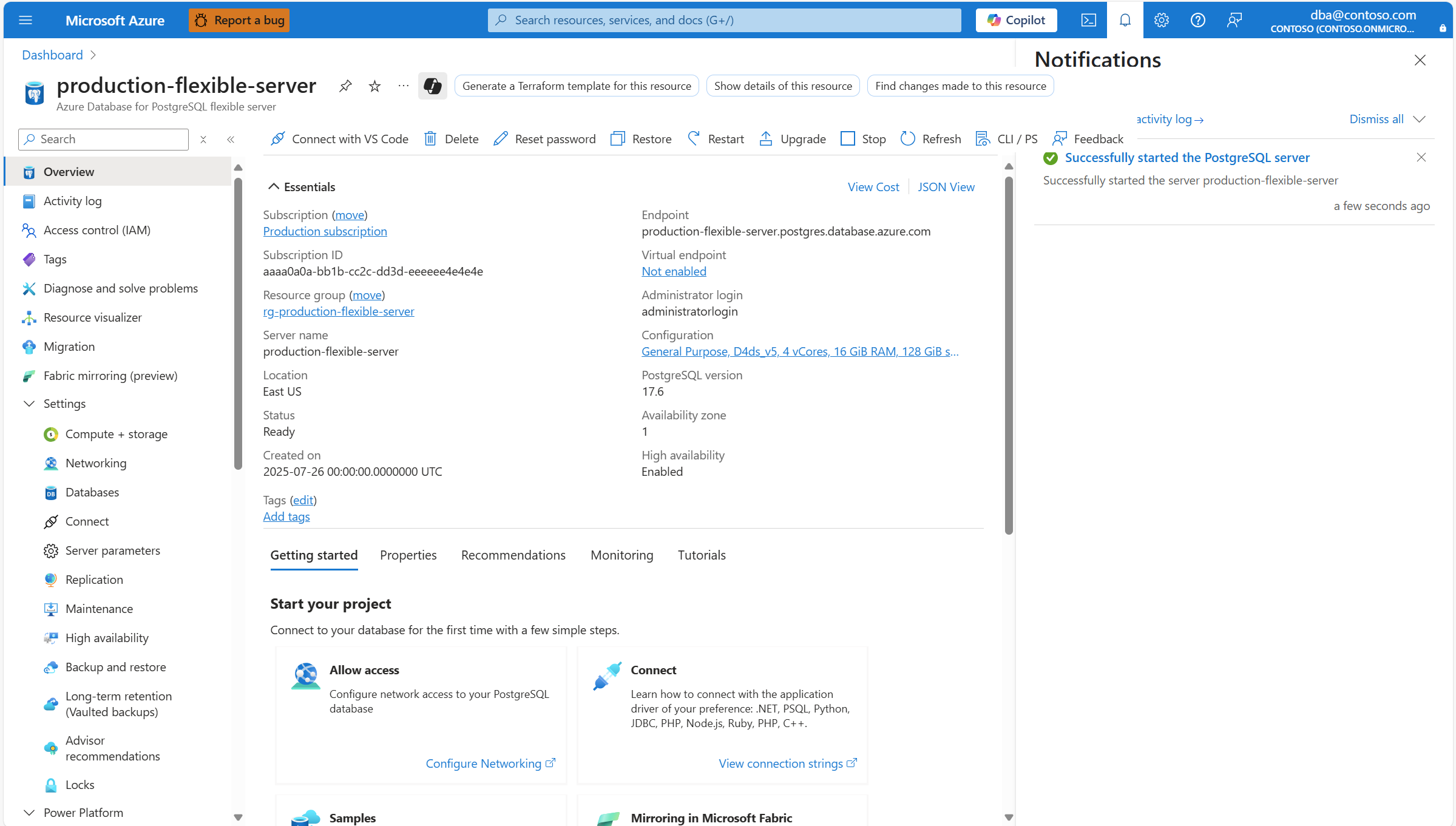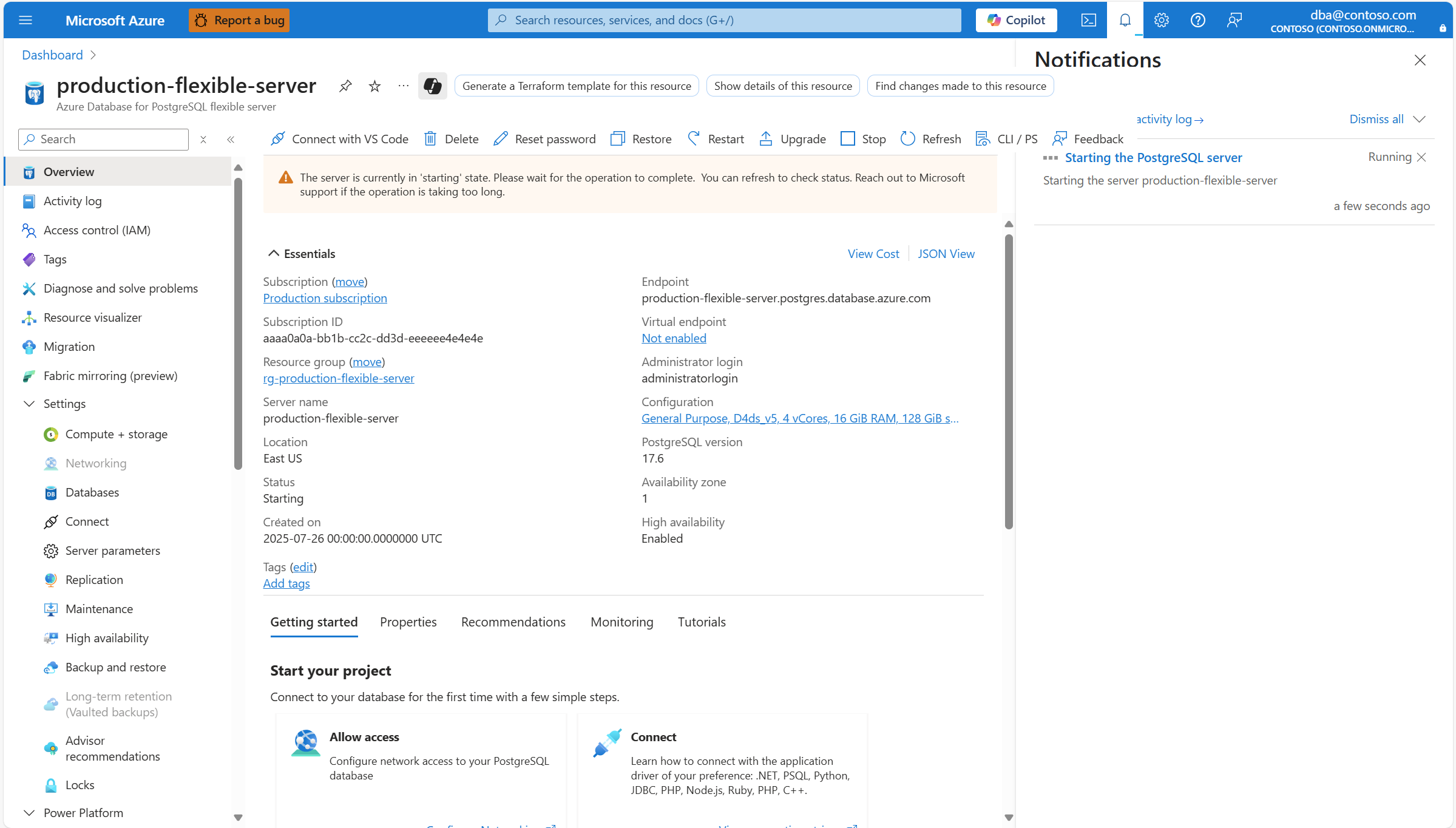 Starting a server depends on the available capacity in the region. During capacity outages, the server start operation is not guaranteed to succeed. Once the server is started, all management operations are available for the Azure Database for PostgreSQL flexible server.