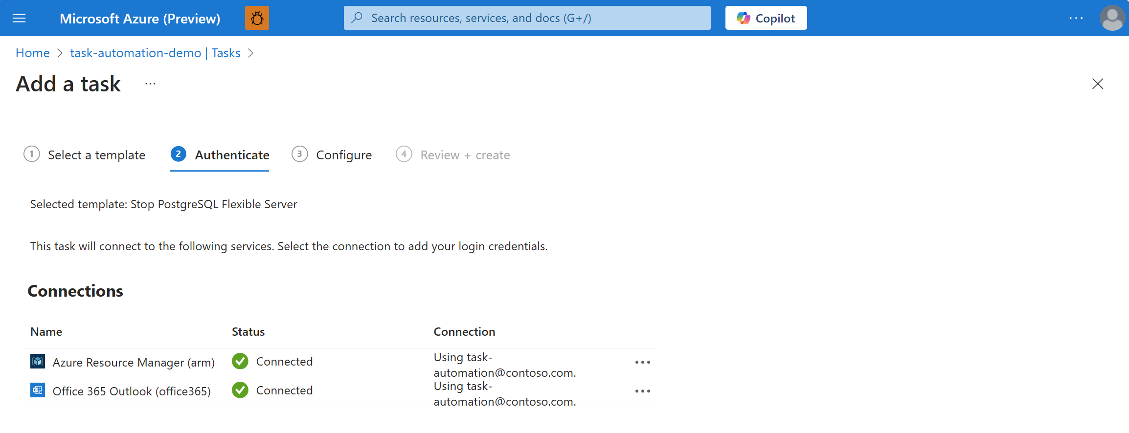 Under Authenticate, in the Connections section, select Create for every connection that appears in the task so that you can provide authentication credentials for all the connections. The types of connections in each task vary based on the task.