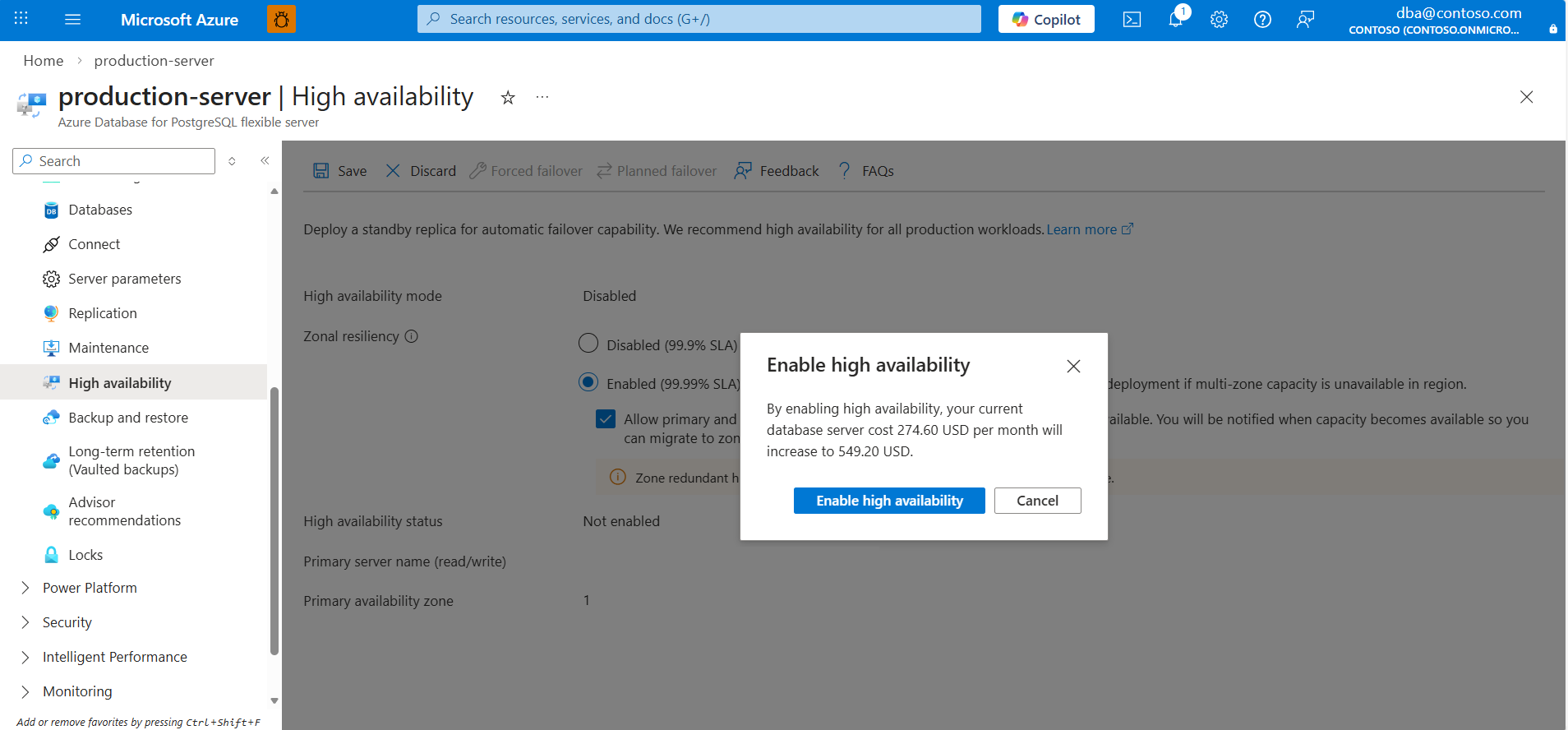 A dialog shows the cost increase associated with the deployment of the standby server. If you decide to proceed, select Enable high availability.