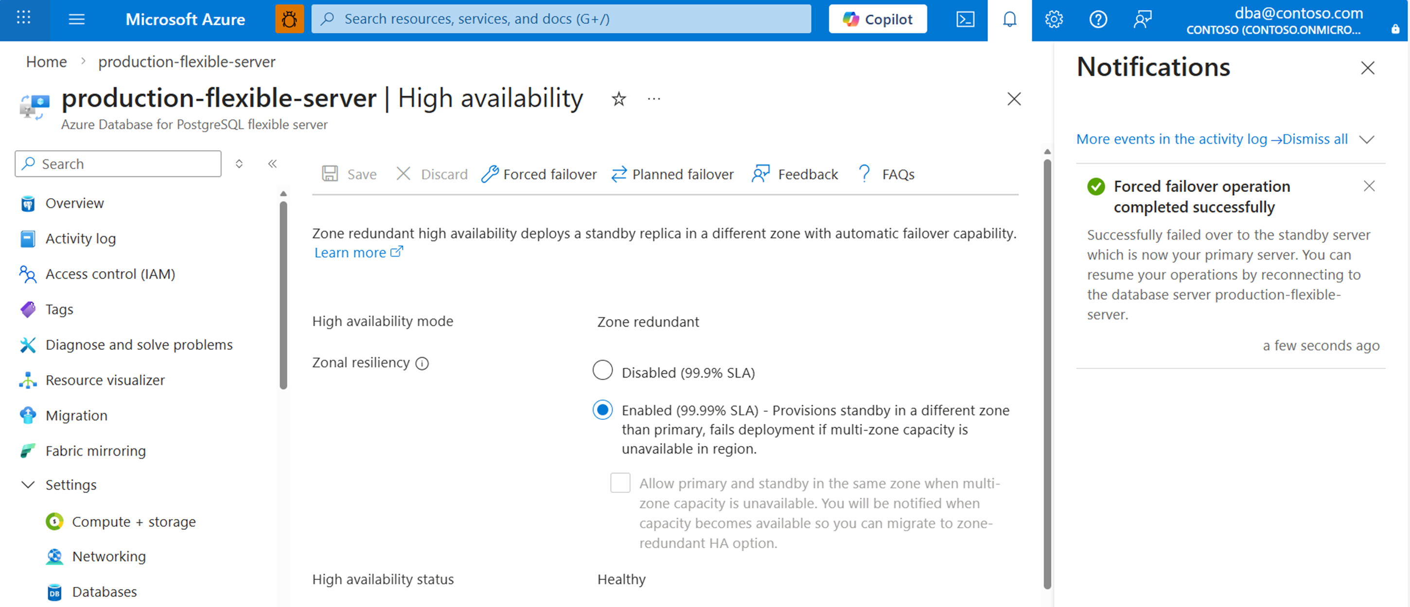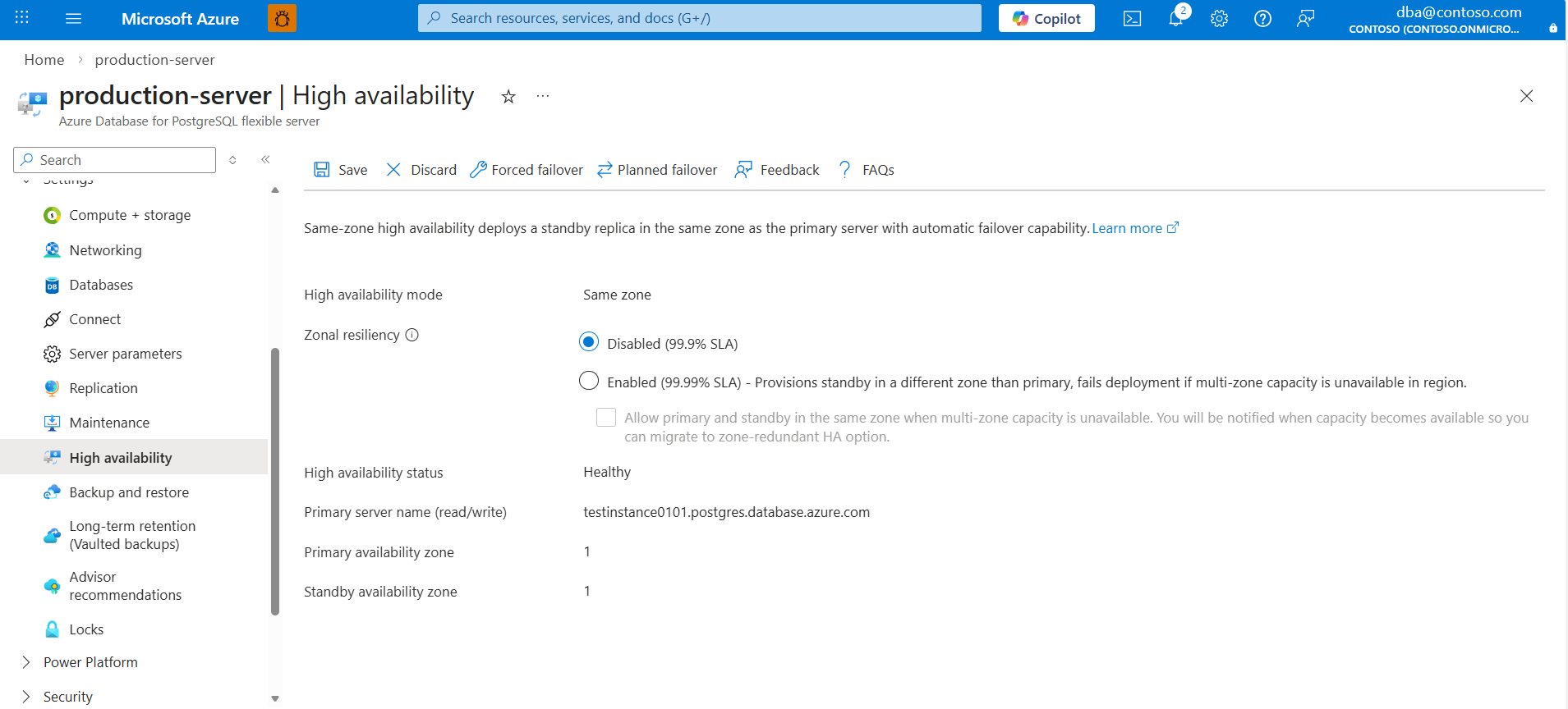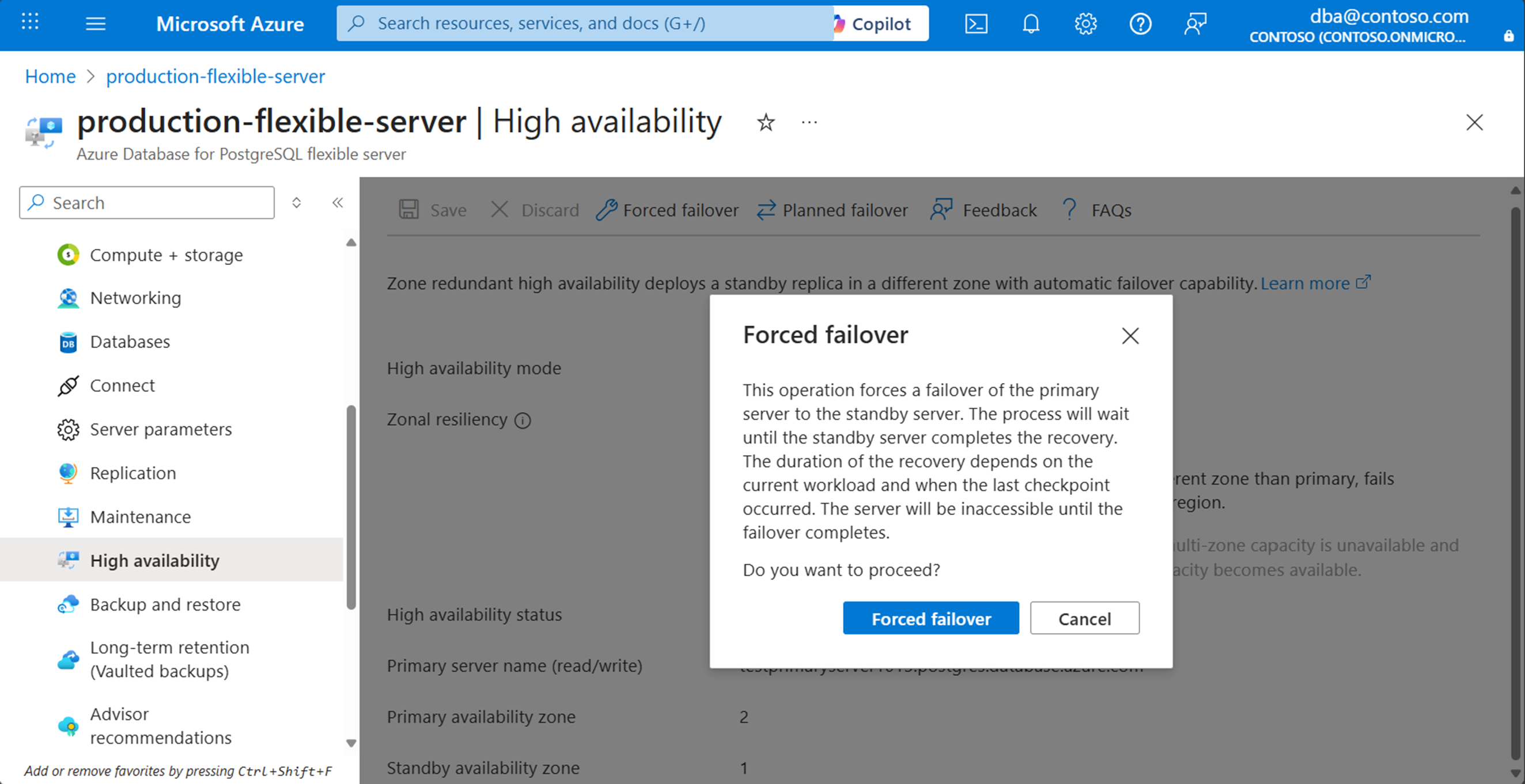 If the high-availability mode is set to Zone redundant, note the values assigned to Primary availability zone and Standby availability zone. They should be reversed after the failover operation finishes.