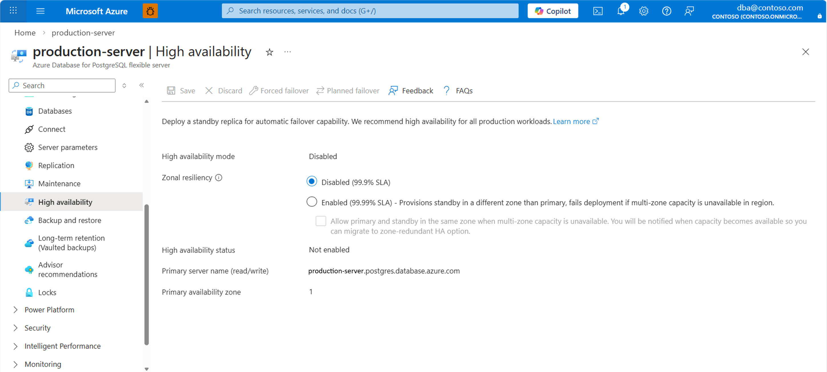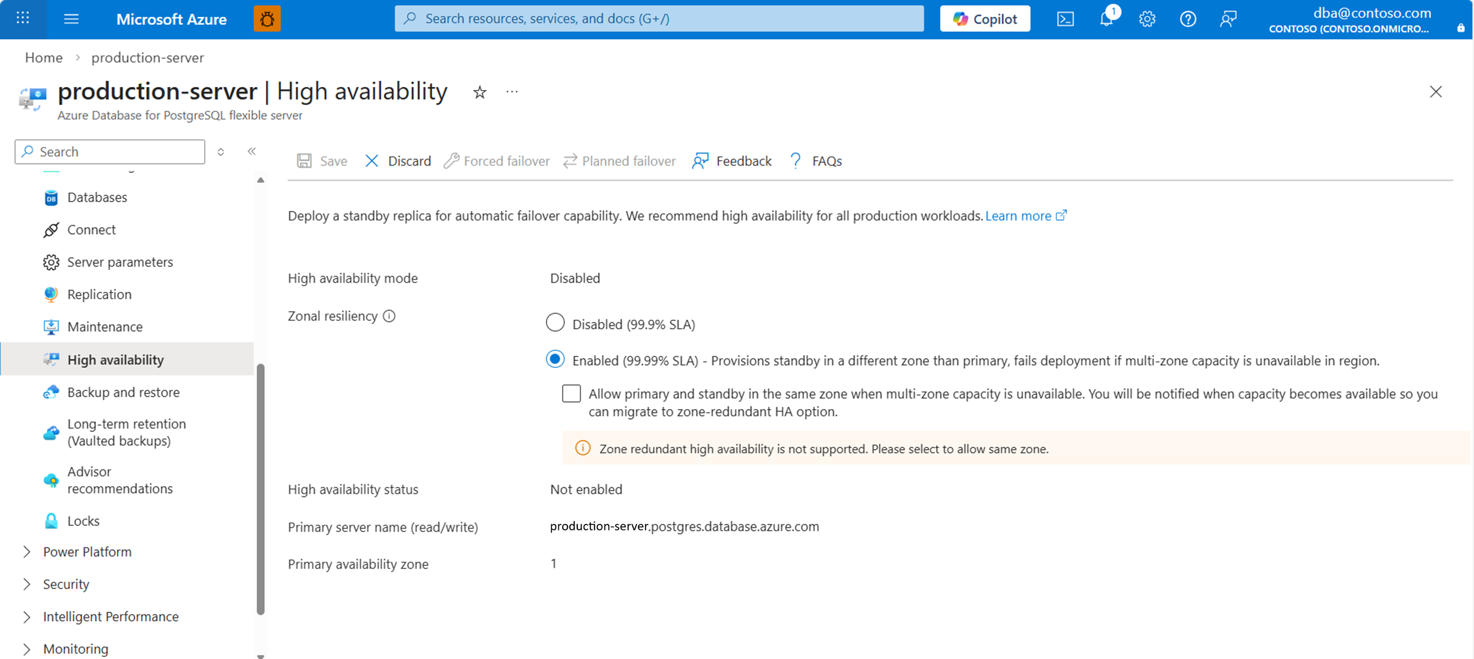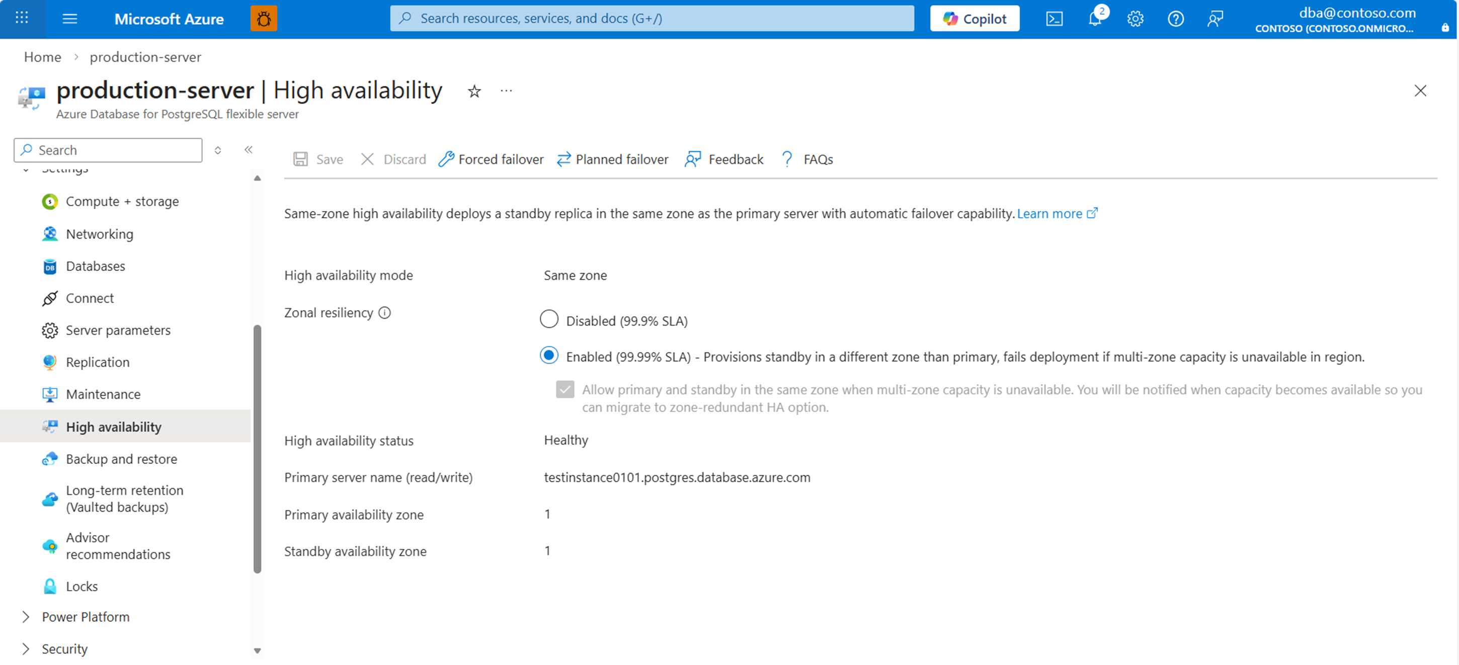 If the high-availability mode is set to Zone redundant, note the values assigned to Primary availability zone and Standby availability zone. They should be reversed after the failover operation finishes.