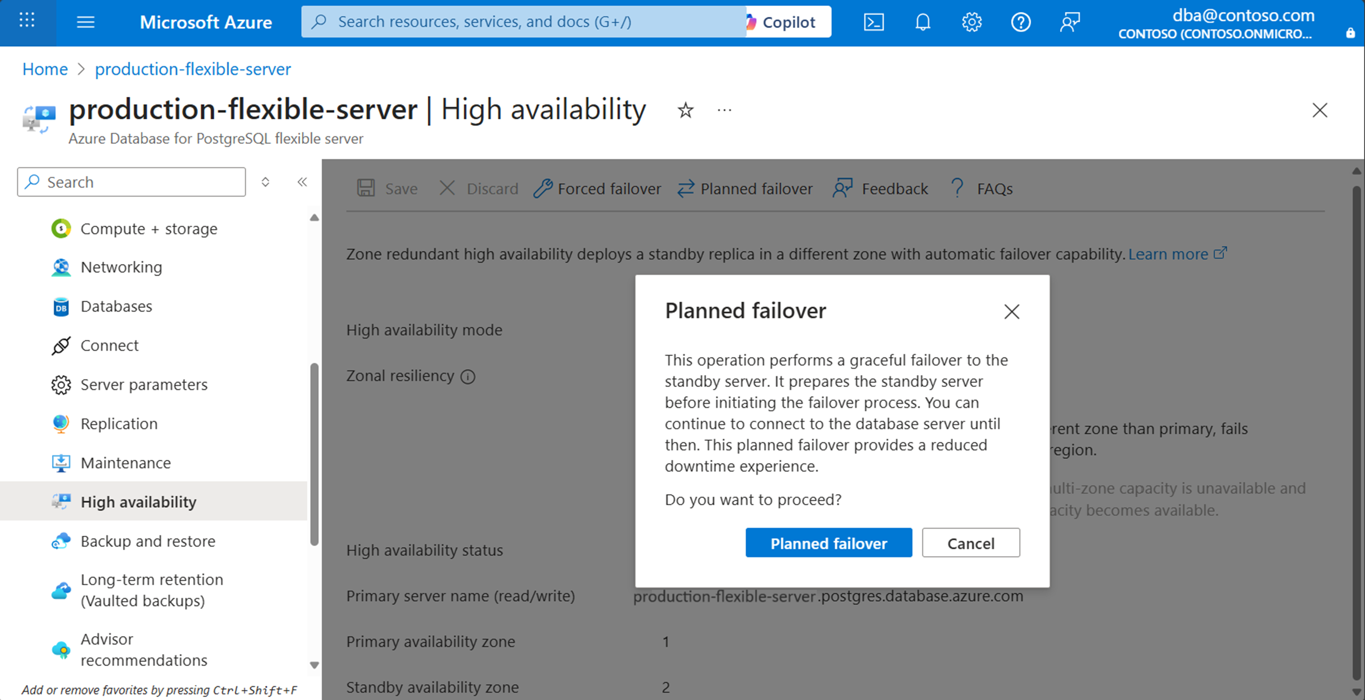 Select Planned failover to start the manual failover procedure. A dialog informs you of the expected downtime until the failover finishes. If you decide to proceed, select Initiate planned failover.