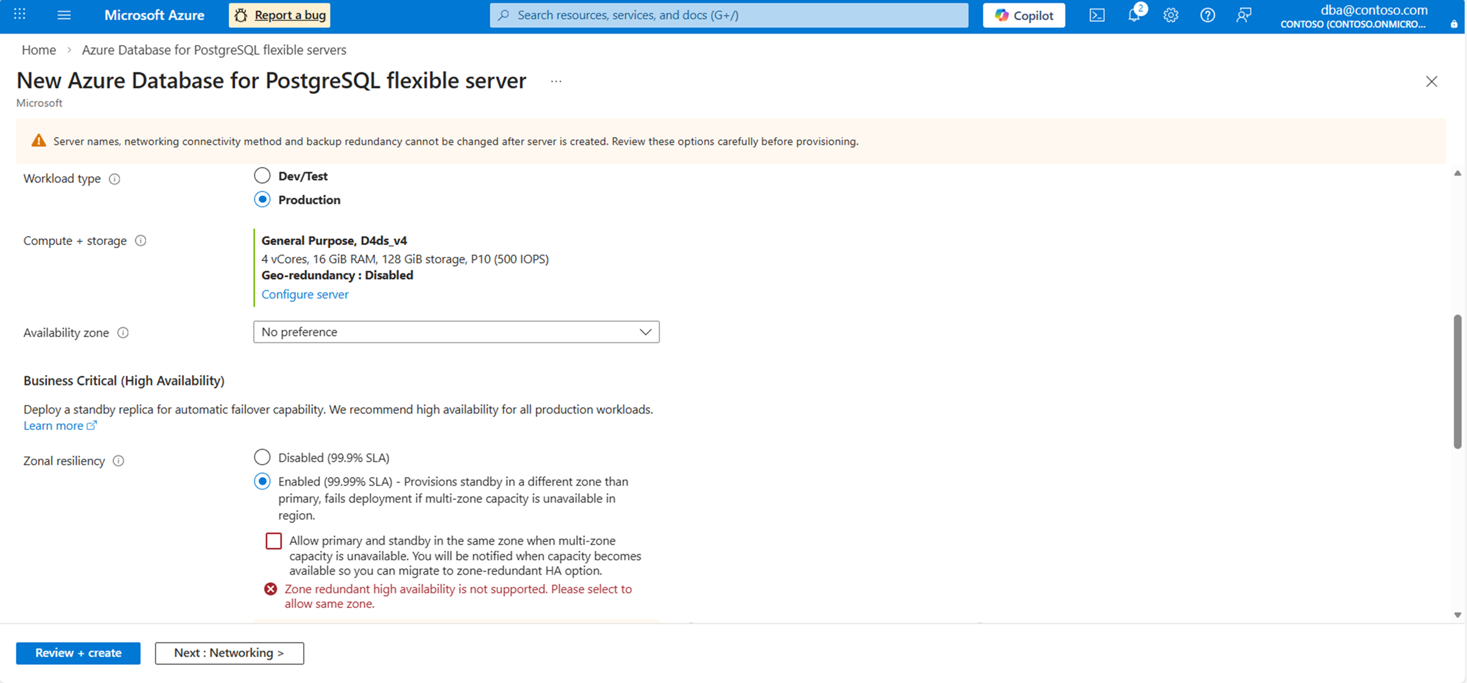 If zonal capacity isn't available, you can select the Allow standby in same zone if zonal resiliency fails checkbox as a fallback. Without selecting this option, you cannot proceed to the next step in the create workflow. This ensures high availability remains enabled. When zonal capacity becomes available, Azure will notify you, and you can then use PITR or read replicas to migrate workloads to a zone-redundant HA configuration for maximum resiliency.