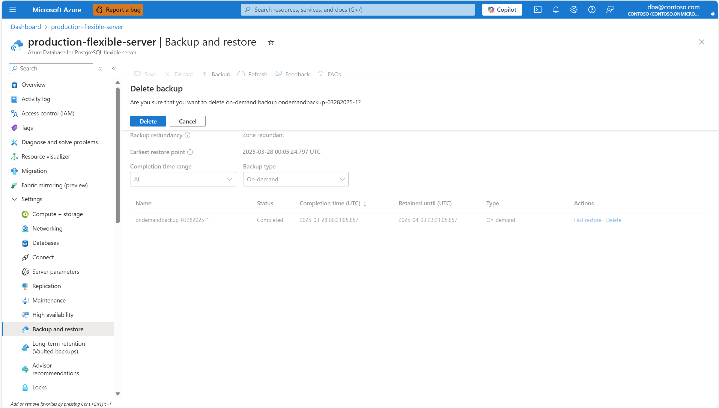 Identify the on-demand backup that you want to delete. Then, under the Actions column, select Delete.
