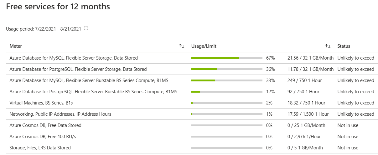 Meter Description Monthly Limit Azure Database for PostgreSQL, Flexible Server Burstable BS Series Compute, B1MS Tracks Compute usage in terms of number of hours of running 750 Hours per month - Burstable B1MS Compute Tier Azure Database for PostgreSQL, Flexible Server Storage, Data Stored Tracks Data Storage Provisioned in terms of GB used per month 32 GB per month - Meter: Identifies the unit of measure for the service being consumed.