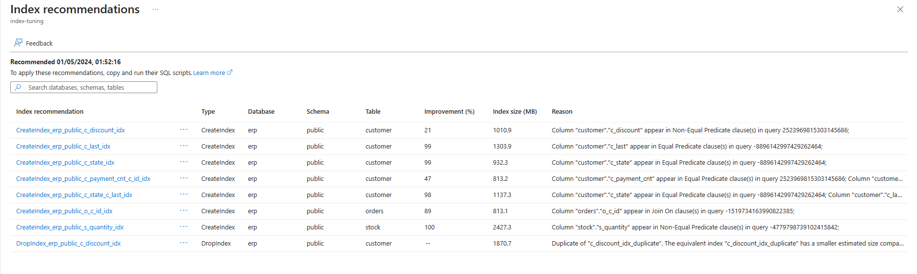 Execute queries on the recommendations view to retrieve the recommendations produced by index tuning for CREATE INDEX and DROP INDEX.