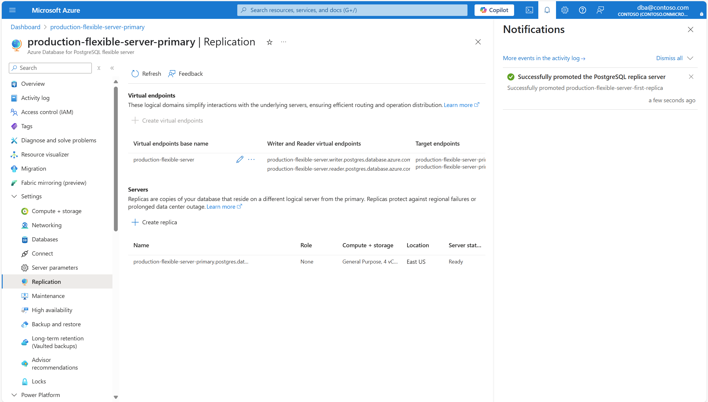 When the process completes, a notification informs you that the read replica successfully promoted to a standalone server.