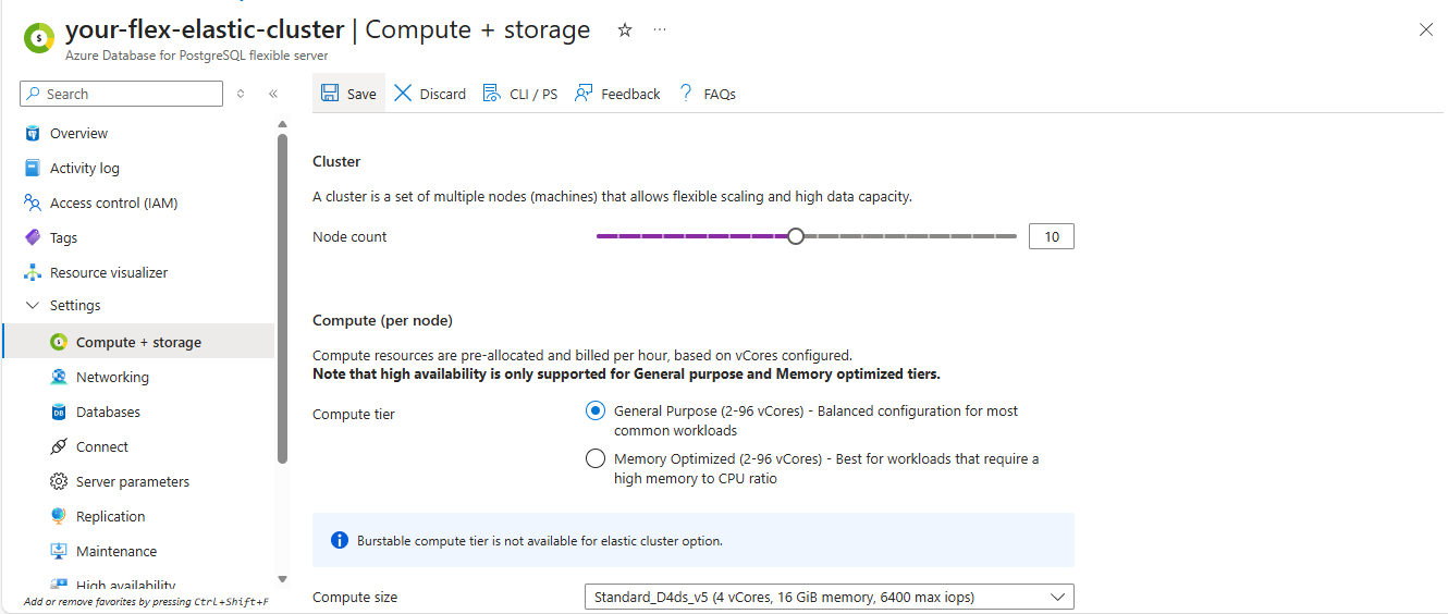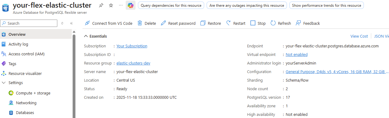 1. Open the resource: In the Azure portal, navigate to your Azure Database for PostgreSQL – Flexible Server elastic cluster.