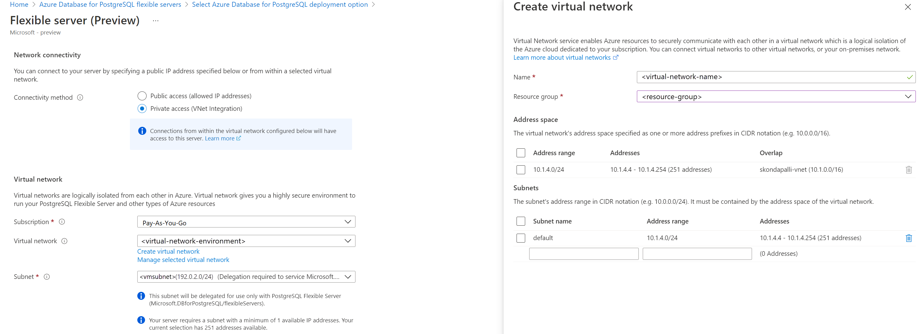 Go to the Networking tab, and select private access. You can't change the connectivity method after you create the server. Select Create virtual network to create a new virtual network vnetenvironment1. Select OK once you have provided the virtual network name and subnet information.