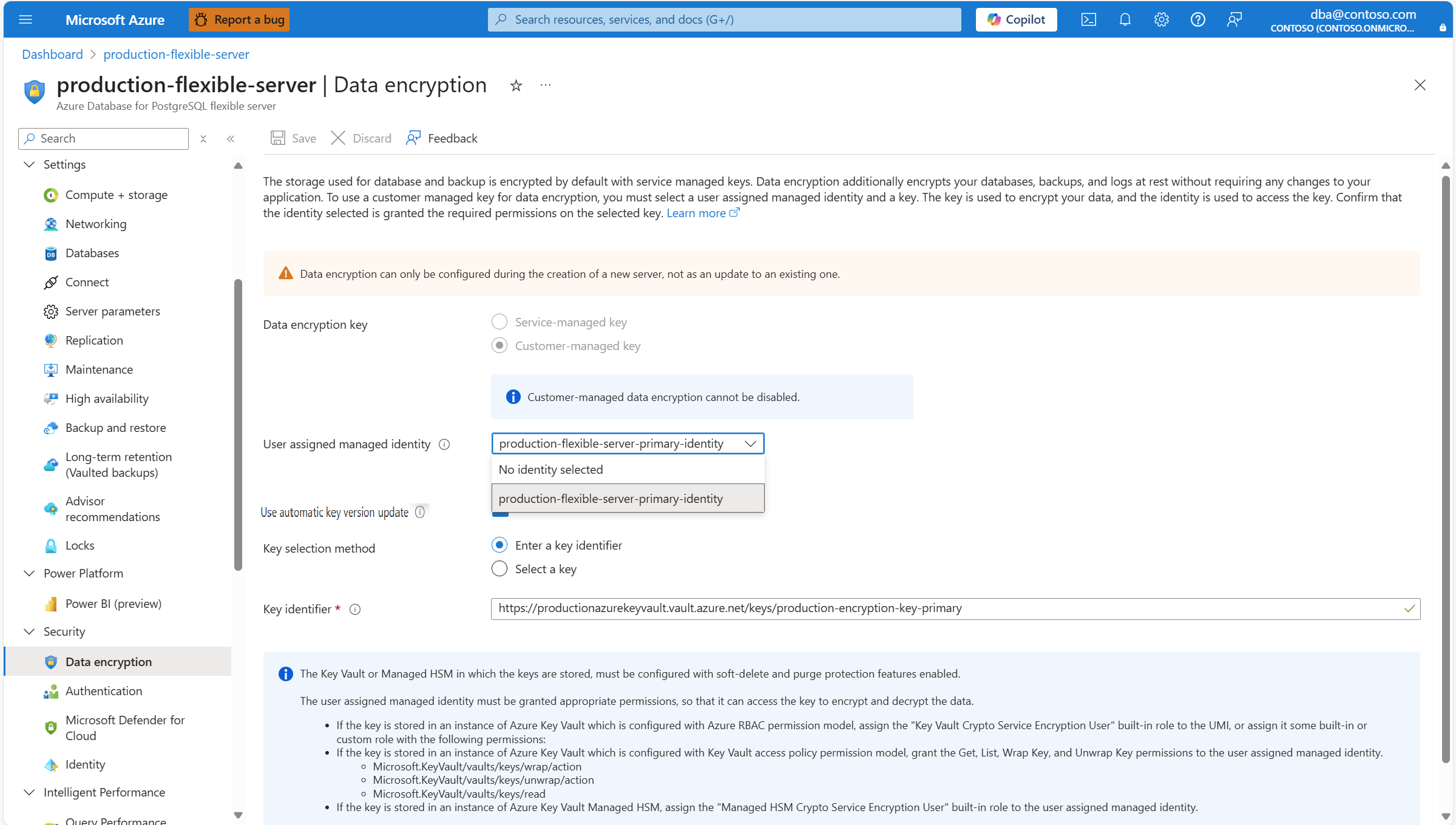 Identities shown in the combo-box are only the ones that your Azure Database for PostgreSQL flexible server instance was assigned. Although it isn't required, to maintain regional resiliency, we recommend that you select user managed identities in the same region as your server. And if your server has geo-backup redundancy enabled, we recommend that the second user managed identity, used to access the data encryption key for geo-redundant backups, exists in the paired region of the server.