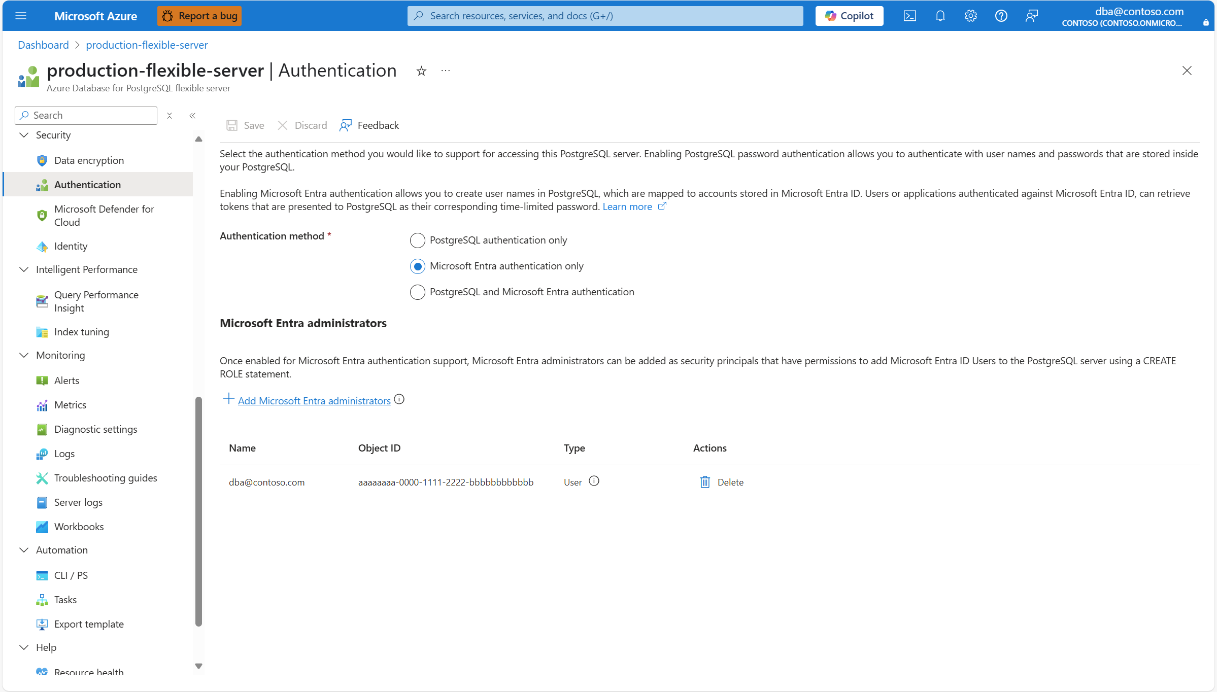 Authentication method must be either PostgreSQL authentication only or PostgreSQL and Microsoft Entra authentication for the Reset password button to be enabled on the toolbar. When set to Microsoft Entra authentication only, the Reset password button is disabled.