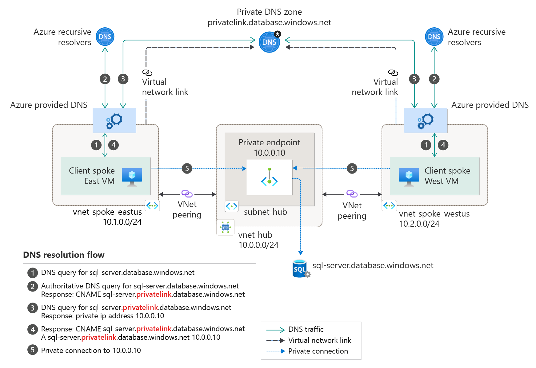 This scenario uses the Azure SQL Database-recommended private DNS zone. For other services, you can adjust the model using the following reference: Azure services DNS zone values.