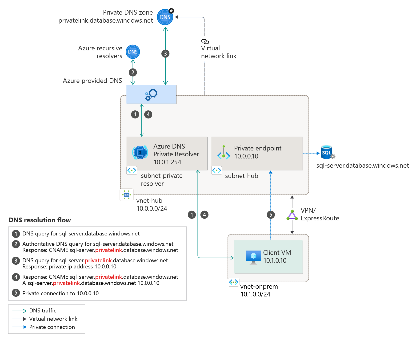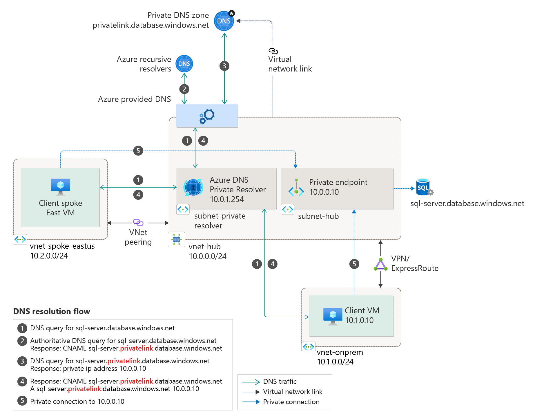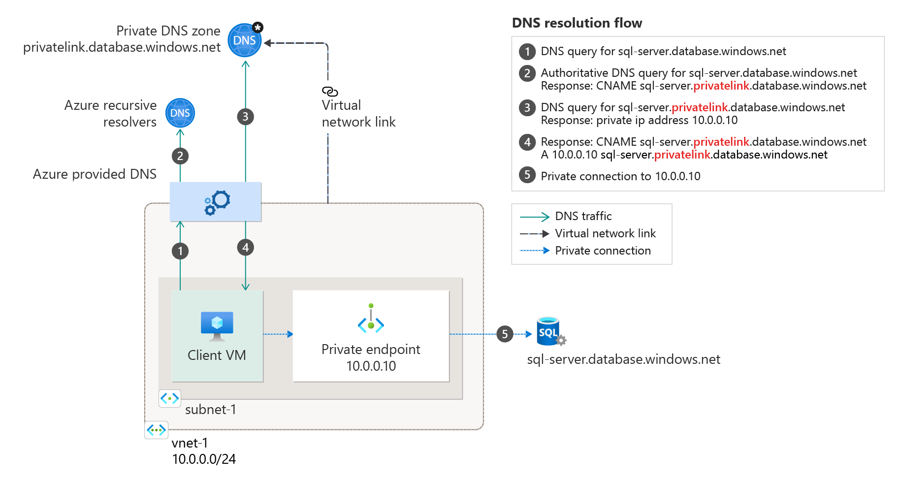 DNS queries for private endpoints must originate from the virtual network that is linked to the private DNS zone. The DNS forwarder enables this by proxying queries on behalf of on-premises clients. This scenario uses the Azure SQL Database-recommended private DNS zone. For other services, you can adjust the model using the following reference: Azure services DNS zone configuration.