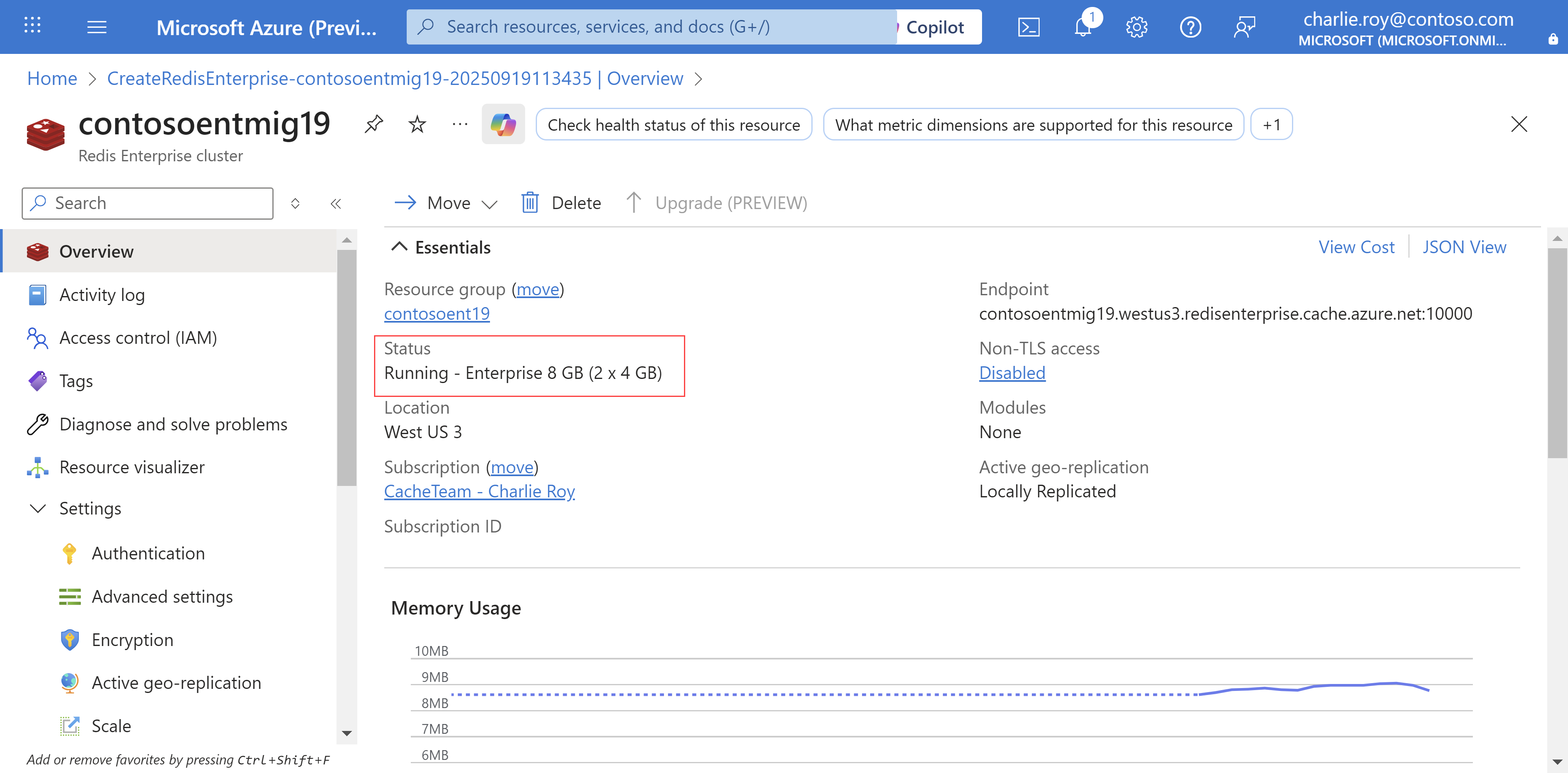 Looking at the Status on Overview pane, you see Running - Enterprise 8GB (2 x 4GB). This notation means the cache is currently using a E5 Enterprise SKU with a scale of 2, yielding an 8-GB cache. Therefore, you should start with at least 10GB cache on Azure Managed Redis.