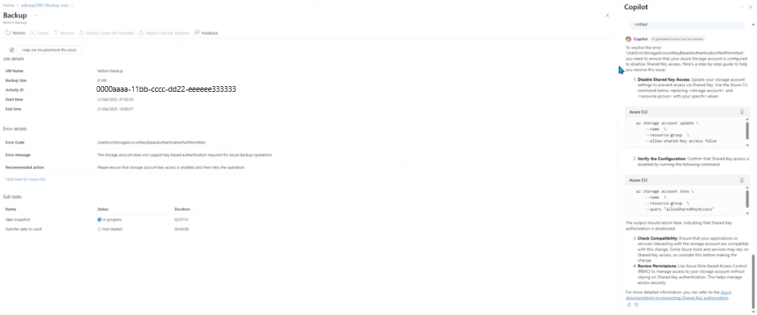 On the Copilot pane, select Open Backup Item to view the error code descriptions and recommendations with guided steps to fix issues.