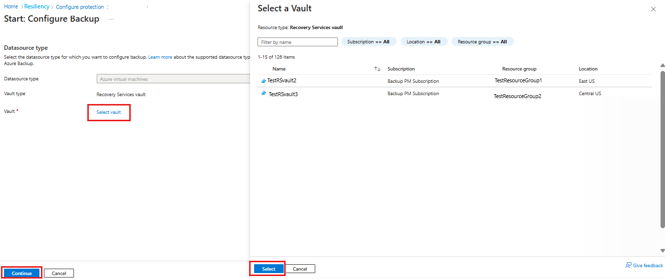 On the Start: Configure Backup pane, under Vault, click Select vault.