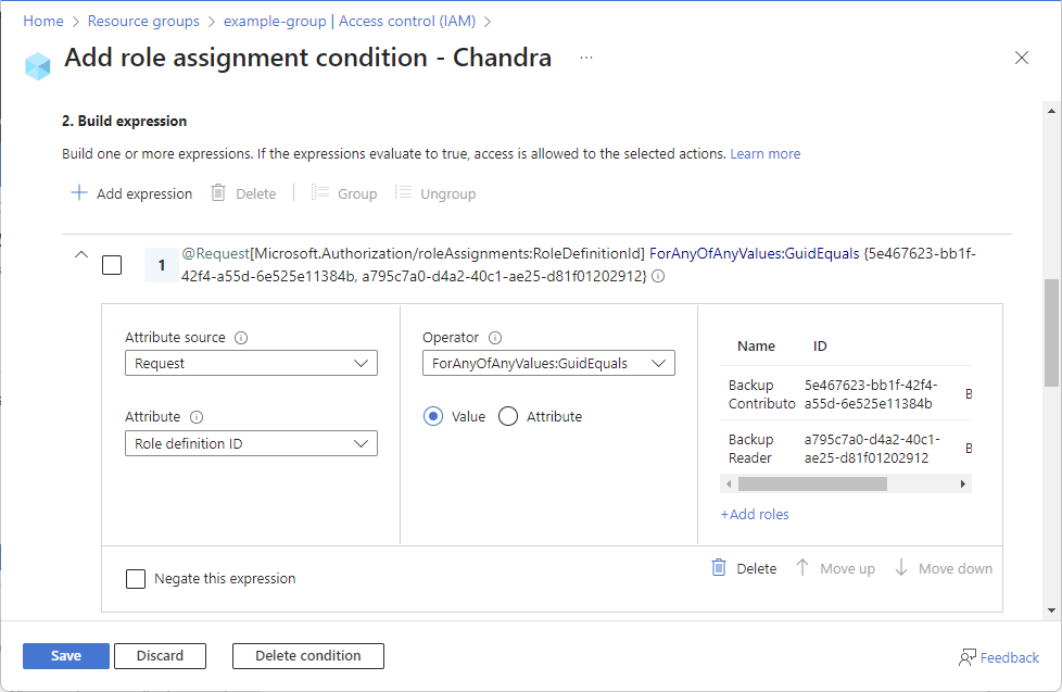 Once you know the permissions that delegate needs, you use the following steps to add a condition to the delegate's role assignment. For example conditions, see Examples to delegate Azure role assignment management with conditions.