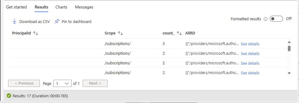authorizationresources | where type =~ "microsoft.authorization/roleassignments" | where id startswith "/subscriptions" | extend PrincipalId = tostring(properties.principalId) | extend Scope = tolower(properties.scope) | extend RoleDefinitionId = tolower(tostring(properties.roleDefinitionId)) | join kind = leftouter ( authorizationresources | where type =~ "microsoft.authorization/roledefinitions" | extend RoleName = tostring(properties.roleName) | extend RoleId = tolower(id) | extend RoleType = tostring(properties.type) | where RoleType == "BuiltInRole" | extend RoleId_RoleName = pack(RoleId, RoleName) ) on $left.RoleDefinitionId == $right.RoleId | summarize count_ = count(), AllRD = make_set(RoleId_RoleName) by PrincipalId, Scope | where count_ > 1 | order by count_ descThe following shows an example of the results. The count_ column is the number of different built-in role assignments with the same principal and same scope. The count is sorted in descending order.