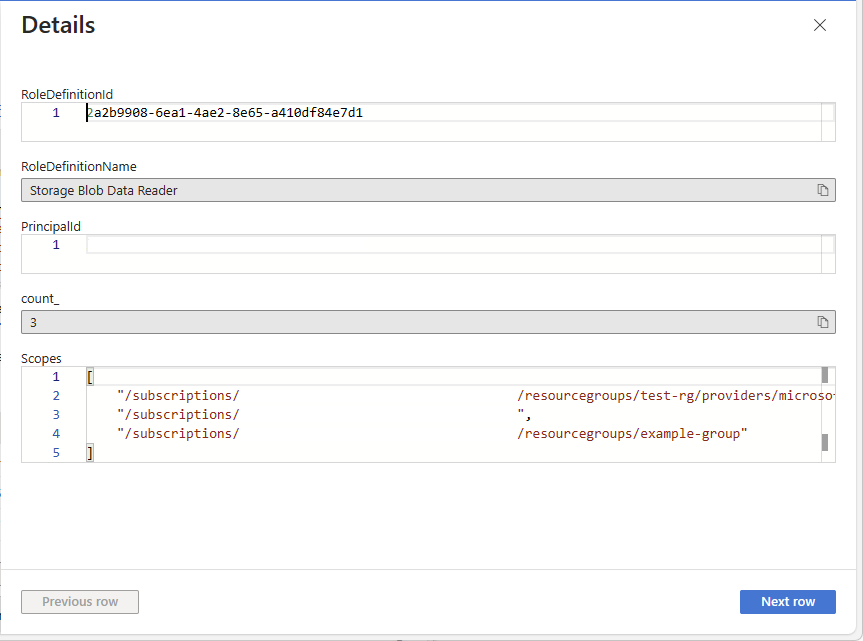 Column Description RoleDefinitionId ID of the currently assigned role. Scope Scope for the role assignment, which will be a subscription, resource group, or resource. RoleDefinitionName Name of the currently assigned role. count_ Number of principals assigned the same role and at the same scope. AllPrincipals List of principal IDs assigned the same role and at the same scope. Use RoleDefinitionId, RoleDefinitionName, and Scope to get the role and scope.