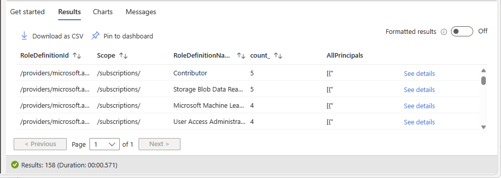 authorizationresources | where type =~ "microsoft.authorization/roleassignments" | where id startswith "/subscriptions" | extend RoleId = tolower(tostring(properties.roleDefinitionId)) | join kind = leftouter ( authorizationresources | where type =~ "microsoft.authorization/roledefinitions" | extend RoleDefinitionName = tostring(properties.roleName) | extend RoleId = tolower(id) | project RoleDefinitionName, RoleId ) on $left.RoleId == $right.RoleId | extend principalId = tostring(properties.principalId) | extend principal_to_ra = pack(principalId, id) | summarize count_ = count(), AllPrincipals = make_set(principal_to_ra) by RoleDefinitionId = RoleId, Scope = tolower(properties.scope), RoleDefinitionName | where count_ > 1 | order by count_ descThe following shows an example of the results. The count_ column is the number of principals assigned the same role and at the same scope. The count is sorted in descending order.