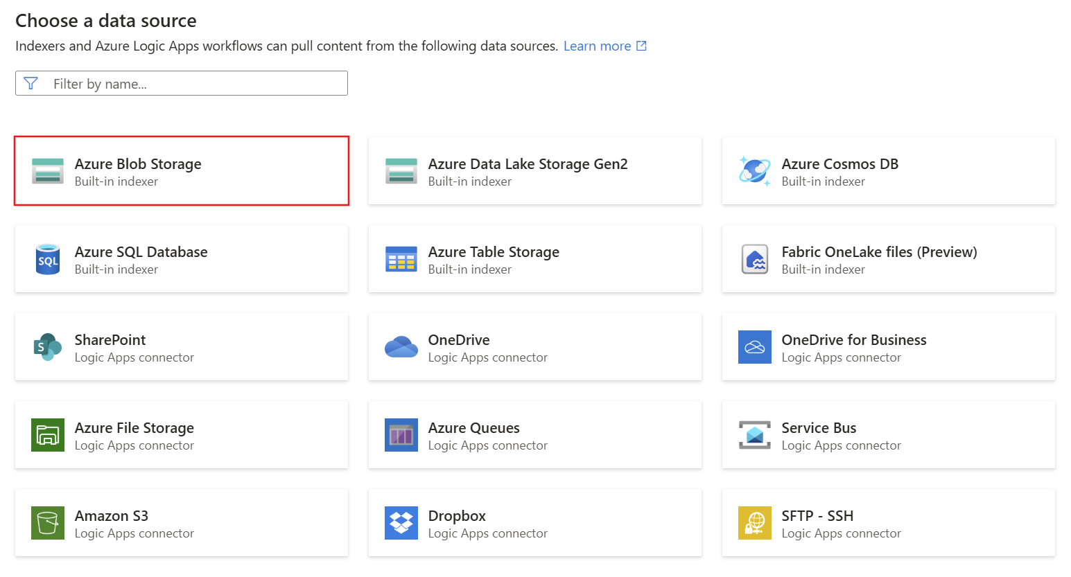 The Import data (new) wizard now supports keyword search, which was previously only available in the Import data wizard. We recommend the new wizard for an improved search experience. For more information about how we're consolidating the wizards, see Import data wizards in the Azure portal.